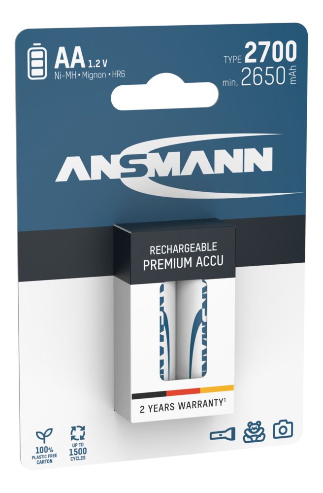 Do urządzeń o dużym poborze mocy — szybka i duża moc wyjściowaProfesjonaliści i częsty użytkownicy preferują baterie o najwyższej pojemności. Baterie te są zatem idealne do zastosowań profesjonalnych o wysokim zapotrzebowaniu na energię, takich jak aparaty cyfrowe, lampy błyskowe, urządzenia medyczne itp.Te baterie o dużej pojemności mogą dostarczyć maksymalną moc w krótkim czasie. Samorozładowanie nie jest czynnikiem.Wysokie standardy bezpieczeństwa i dobra stabilność cykluAkumulatory są naturalnie zgodne z obowiązującą dyrektywą UE i spełniają najwyższe standardy bezpieczeństwa i trwałości. Dzięki doskonałej stabilności cyklu ogniwa NiMH można ładować do 1500 razy.Przetestowana jakośćAkumulatory ANSMANN zostały pomyślnie przetestowane pod kątem wymagań elektrycznych, termicznych, geometrycznych i mechanicznych. Dzięki rygorystycznym testom w Niemczech i na Dalekim Wschodzie możemy zagwarantować najwyższą jakość produktu. Nasi eksperci ds. jakości regularnie monitorują zgodność z naszymi wysokimi wymaganiami i międzynarodowymi standardami.Szybkie ładowanieAkumulatory można ładować wysokim prądem ładowania, co pozwala na bardzo krótkie czasy ładowania.Szeroki zakres temperaturAkumulatory można stosować w temperaturach od -20°C do +50°C.Chroni środowisko i portfelAkumulatory NiMH można stosować wszędzie tam, gdzie stosuje się baterie jednorazowego użytku. Oszczędza to pieniądze i pomaga chronić środowisko.Brak efektu pamięciDzięki najnowszej technologii akumulatorów efekt pamięci jest eliminowany nawet po wielokrotnym częściowym ładowaniu.Dane techniczneWięcej informacjiRozmiar ogniwa Mignon AAChemia ogniwa Niklowo-metalowo-wodorkoweNapięcie znamionowe 1,2 VPojemność znamionowa 2700 mAhMinimalna pojemność 2500 mAhLiczba ogniw w opakowaniu 2energia 3,2 WhKolor srebrnyOpakowanie blistryTemperatura przechowywania -20 - 50 °CTemperatura pracy -20 - 50 °CZakres dostawy2× akumulator NiMH typu Mignon AA 2700 mAh (min. 2500 mAh)