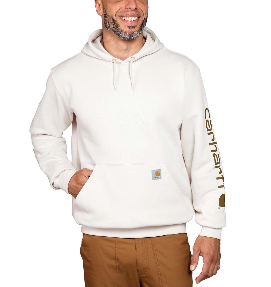 Męska, klasyczna bluza Carhartt z logo na rękawie. Wykonana z miękkiej mieszanki bawełny i poliestru dla zwiększenia trwałości. Wykorzystywana z powodzeniem zarówno jako produkt codzienny jak i w ciężkich warunkach przez fanów marki dbających o swój wizerunek również w pracy. Kaptur regulowany sznurem zapewnia dodatkowe ciepło i ochronę. Najważniejsze funkcje i elementy produktu: • Materiał: Gramatura materiału 10,5oz/yd 2 - 356g/m 2 Kolor: Black, Carbon Heather, New Navy: 50% bawełna / 50% poliester Kolor: Heather Grey/Black: 70% bawełna / 30% polyester Kolor: Malt, Moonstone:: 59% bawełna / 41% polyester • Dopasowanie: Loose Fit • Trzy częściowy kaptur ściągany sznurem • Mosiężne okucia otworów na sznur • Ciepła przednia kieszeń • Ściągacze w mankietach i w pasie wzmacniane spandeksem • Potrójne szwy w newralgicznych miejscach • Duża grafika na rękawie