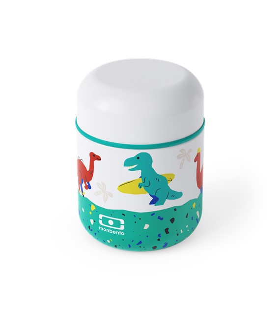 Termos obiadowy Dino Capsule Monbento:- izolujący potrawy do 5 h,- ozdobiony motywem dinozaurów,- wykonany ze stali nierdzewnej 18/8 oraz polipropylenu, uszczelka silikonowa,- materiały bez BPA,- szczelny,- można myć w zmywarce (bez pokrywki),- przeznaczony dla dzieci od 4 roku życia.