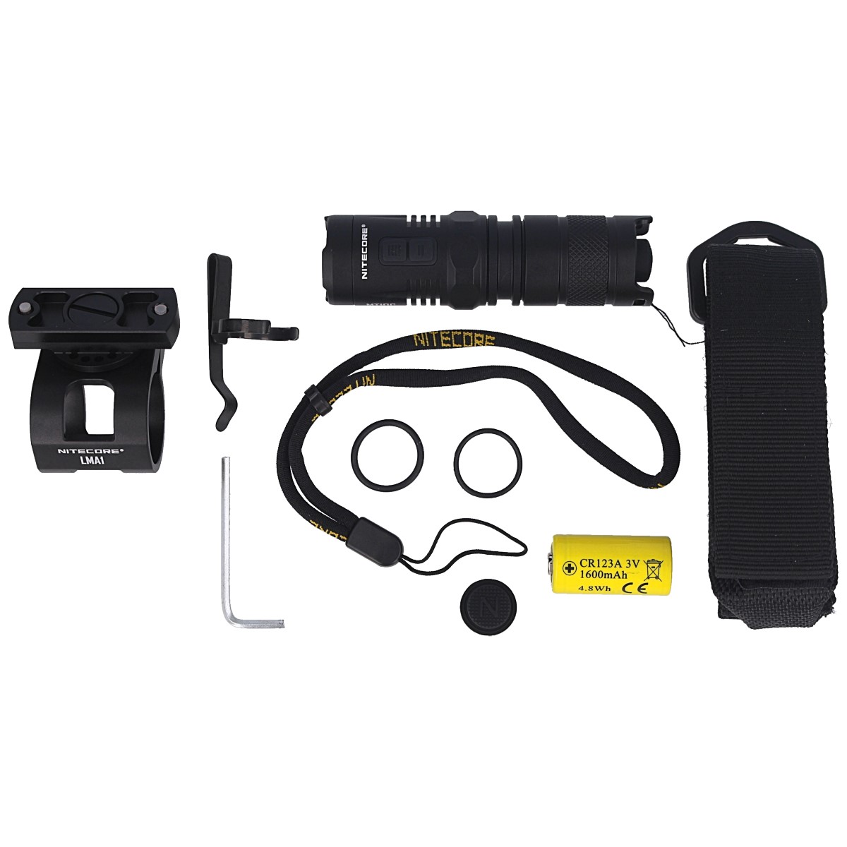 W zestawie znajdują się również akcesoria, takie jak: akumulator Nitecore NL1665R, ładowarka USB, pokrowiec, klips, smycz, pokrywa zapasowa na końcówkę, uszczelka zapasowa oraz kabel ładowania Micro-USB.
