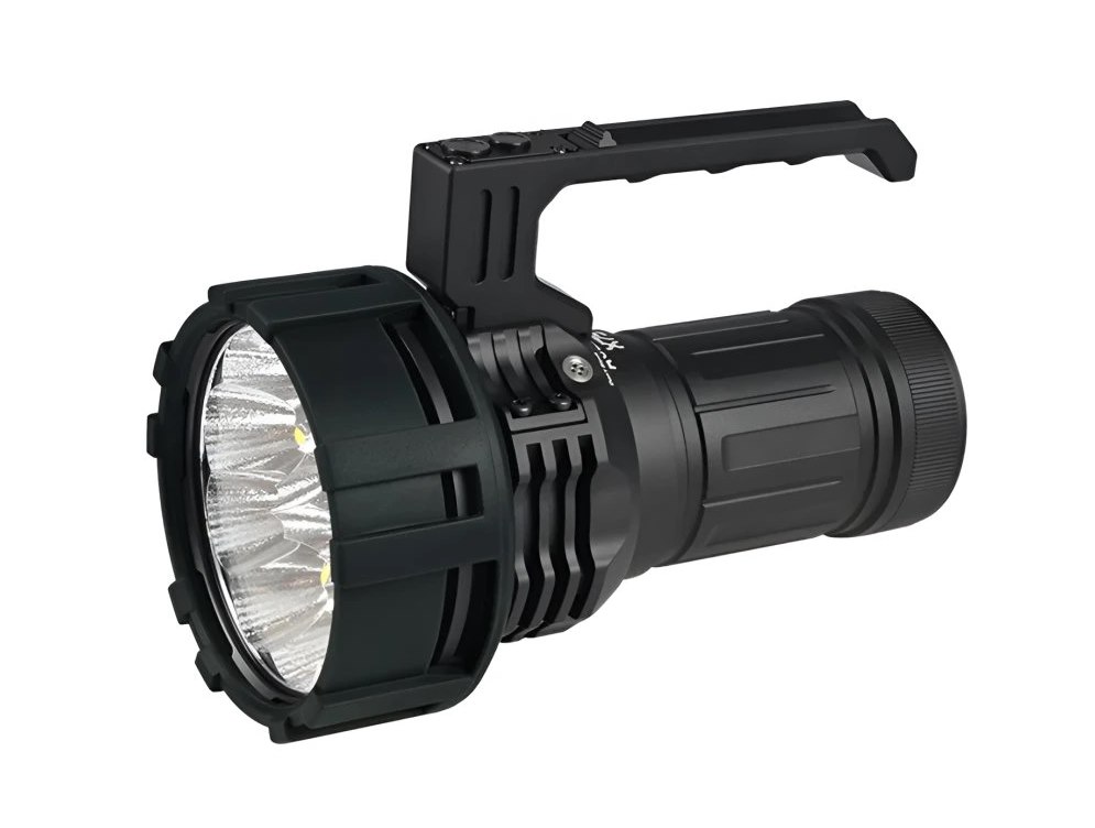 Kluczowe cechy- 12x dioda CREE XHP70.2- Strumień świetlny 80000 lm- Temperatura barwowa 5000K - Jasność 330625 cd- Zasięg 1150 m- 7 trybów oświetlenia (Ultra-niski, niski, średni 1, średni 2, wysoki, turbo i stroboskop); 2 scenariusze (Power i Eco)- Waga 1240 g (z baterią)- Odporność IP68 (zanurzenie do głębokości dwóch metrów)- Zasilanie za pomocą własnego akumulatora o pojemności 20400 mAh- Ładowanie przez ukryty port USB-C- Wskaźnik stanu ładowania- Szybkie ładowanie/rozładowanie 60W- Funkcja powerbanku- Korpus wykonany ze stopu aluminium z powłoką HAIII, która charakteryzuje się wysoką odpornością na uszkodzenia mechaniczne- Hartowane ultra czyste szkło z powłoką antyrefleksyjną- Możliwość postawienia na dolnej krawędzi i użycia latarki jako świecy- Uchwyt- Dwa przełączniki ze stali nierdzewnej- Mechaniczna blokada przed przypadkowym włączeniem- Gumowa osłona chroniąca przed upadkiem- Gwint do statywu- Czarny kolor
