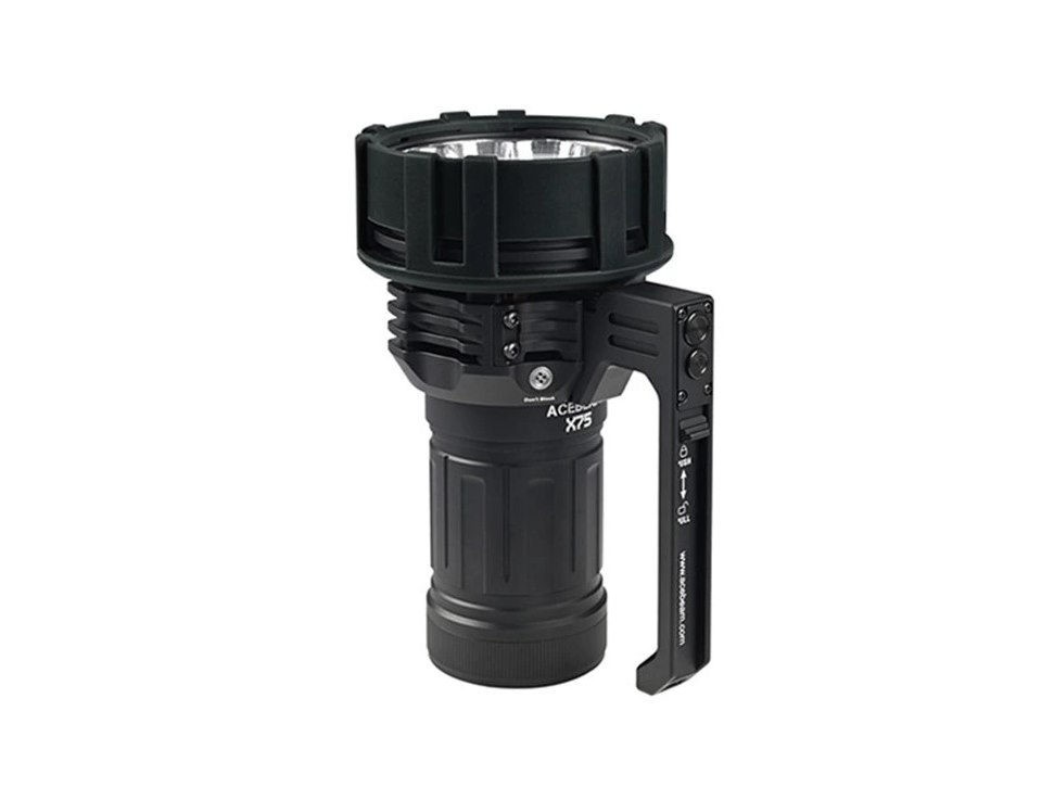 Latarki AceBeam serii X zostały opracowane z jednym celem - stworzyć najpotężniejsze latarki na świecie. Model X75 w wersji z dwunastoma diodami LED CREE XHP70.2 osiąga ekstremalną wartość strumienia świetlnego 80000 lumenów, a zasięg wynosi imponujące 1150 metrów. Intensywność można przełączać między siedmioma trybami - ultra-niski, niski, średni1, średni2, wysoki i turbo, przy którym osiąga wartość 80000 lumenów. Ten ekstremalny wydajność wymagał również masywnego miedzianego chłodzenia z inteligentną regulacją temperatury. Ostatnim trybem jest tryb stroboskopowy. Latarka dodatkowo pamięta ostatnio wybraną intensywność po wyłączeniu i po ponownym włączeniu uruchamia się w tym trybie.