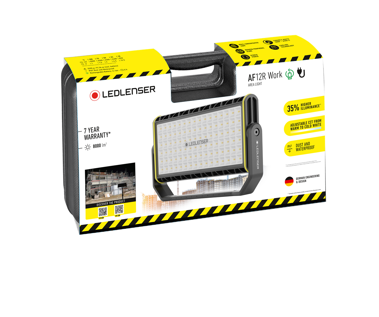 Ledlenser AF12R Work to przenośna latarka o dużej mocy, idealna do użytku na budowie, dla służb ratunkowych i warsztatów. Może pracować na zintegrowanym akumulatorze lub może być zasilany z sieci. Wiodąca w branży 7-letnia gwarancja.