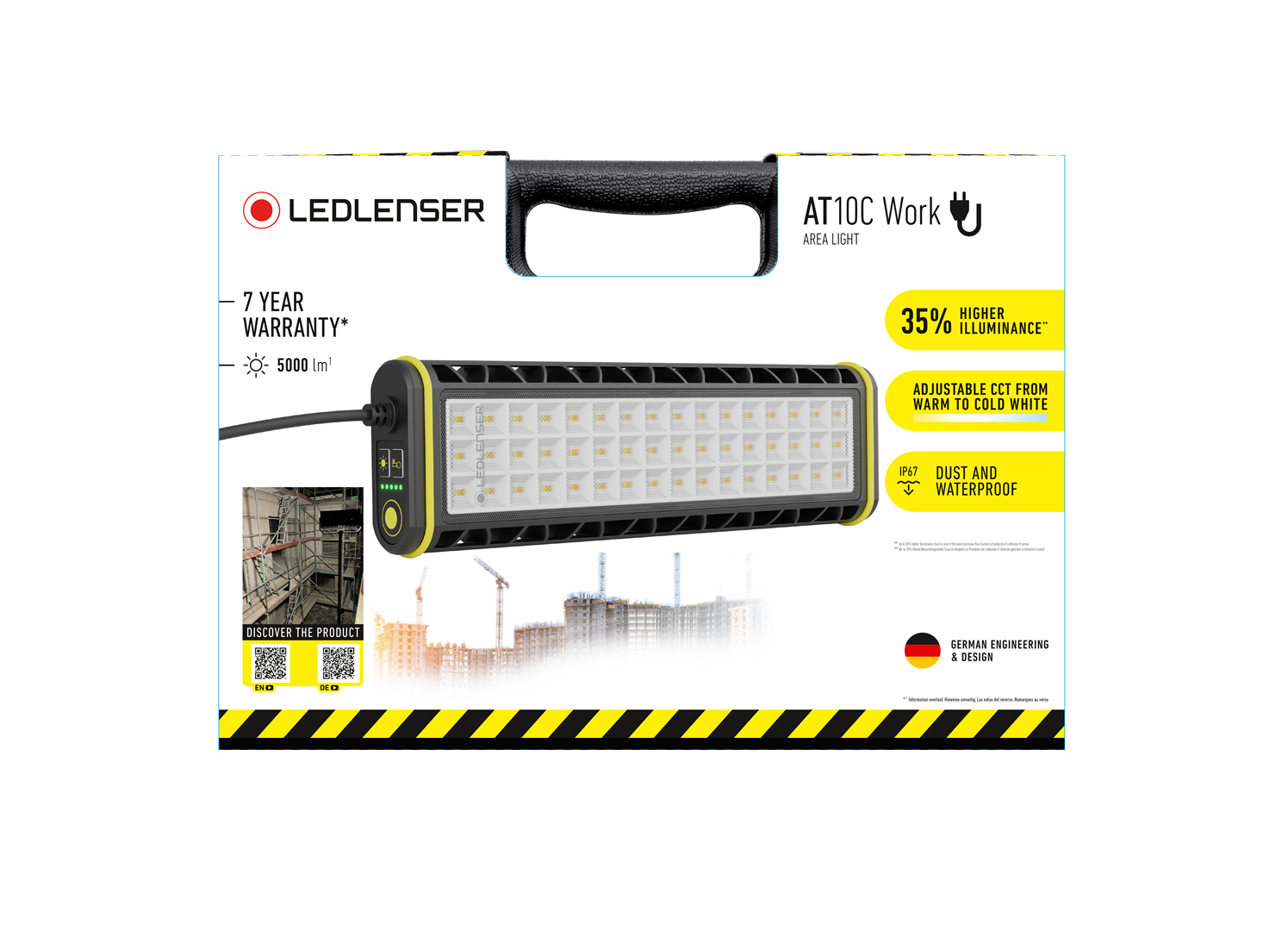 AT10C idealnie nadaje się do użytku w handlu, na placach budowy i w warsztatach, oferując imponującą moc wyjściową 5000 lumenów przy najwyższym ustawieniu. Do wyboru są 3 poziomy oświetlenia, od najwyższego ustawienia wynoszącego 5000 lumenów do 500 lumenów w sytuacjach, w których wymagana jest mniejsza ilość światła. Odblaski są redukowane dzięki technologii wieloskoncentrowanego światła. Lampa jest wyposażona w opcjonalny dyfuzor, który w razie potrzeby redukuje odblaski na krótszych dystansach.