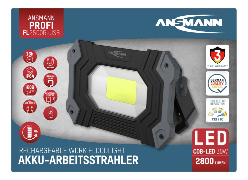 Bezprzewodowa lampa robocza o strumieniu świetlnym 2400 lm (100%) i diodą LED COB o mocy 30 W zintegrowany akumulator litowo-jonowy z elektroniką bezpieczeństwa - 3,7 V / 6600 mAh / 24,42 WhFunkcja power banku dzięki zintegrowanemu wyjściu USB do smartfona itp. Obudowa wykonana z aluminium i narożniki ochronne z wysokiej jakości tworzywa sztucznego - wyjątkowo odporne na uderzenia. Elastyczne zastosowanie dzięki stabilnej podstawie/rączce z regulacją w zakresie 180°Wskaźnik pojemności za pomocą diody LED - kontrola dostępnej pojemnościLampy do realizacji wszystkich Twoich projektów! ANSMANN oznacza jakość i niezawodność! Postawiliśmy sobie za cel oferowanie wysokiej jakości produktów dla profesjonalistów i hobbystów. Nasz FL2500R to profesjonalny reflektor z technologią COB-LED. Niezawodną lampę można łatwo zintegrować z wymagającymi codziennymi pracami w domu i wokół niego, np. w warsztatach, na budowach, w przemyśle, domu, ogrodzie, podwórku czy garażu. Wydajne oświetlenie dzięki zastosowaniu wydajnej technologii COB LED lampa wytwarza intensywne, jasne światło. Lampa osiąga jasność do 2400 lumenów. Dzięki szerokiemu kątowi świecenia jasne światło rozprowadzane jest równomiernie, aby niewielkie szczegóły, jak i duże powierzchnie były jednolicie oświetlone. Światło diod led ma temperaturę barwową ok. 6000K, która nie obciąża oczu Oznacza to przyjemne naturalne, białe światło, które nie męczy i zapewnia komfortową pracę. Solidna, odporna na wstrząsy, odporna na rozlanie wody i odporna na uderzenia obudowa jest szczególnie odporna na obciążenia mechaniczne (IK08). Dzięki stopniowi ochrony IP64 lampa jest w pełni zabezpieczona przed ciałami obcymi (kurz), dotykiem i strumieniem wody pod dowolnym kątem. Pozwala to w pełni skoncentrować się na pracy przy optymalnym oświetleniu wewnątrz i na zewnątrz. Dane techniczne FL2500R jest zasilana potężnym akumulatorem litowo-jonowym o pojemności 6600 mAh. Oznacza to, że reflektor LED może być używany w dowolnym miejscu i czasie. Światło robocze działa do 3 godzin w trybie 100%, 7 godzin w trybie 50% i 13 godzin w trybie 25%. Niezależnie od tego, czy jesteś w podróży, czy w domu, dzięki FL2500R zawsze masz odpowiedni reflektor, który rozjaśnia ciemność! Gotowe do użycia dioda COB wymaga mniej niż 1 sekundy czasu rozruchu, aby zapewnić pełną moc. Oznacza to, że światło natychmiast dostarcza pełną moc.Szczegóły techniczneŹródło światła LED Moc światłą 30 WLekkie tryby 25% / 50% / 100%Zakres świetlny 61 mStrumień świetlny 2.400 Lumen (ang.)Jasność 2.000 Lux (ang.)Temperatura w kolorze 6000 KKlasa ochrony IK IK08Klasa ochrony IP64Temperatura przechowywania -20 - 40 oCTemperatura pracy 5 - 30 oCZakres dostawyKolor Czarny, szaryPakowanie Pudełko kartonoweMateriał obudowy ABS + aluminium