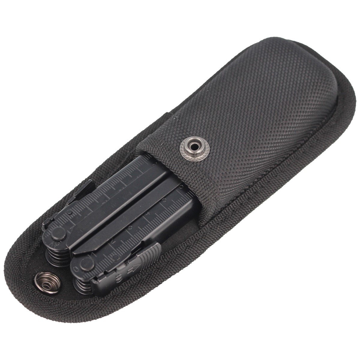 Etui - lekkie, wykonane z nylonu w kolorze czarnym. Zamykana na zatrzask typu Prym kabura dobrze zabezpiecza miltitool przed wypadnięciem. Umożliwia mocowanie pochwy pod taśmy systemu M.O.L.L.E. lub przenoszenie na pasie lub oporządzeniu w pozycji poziomej lub pionowej.