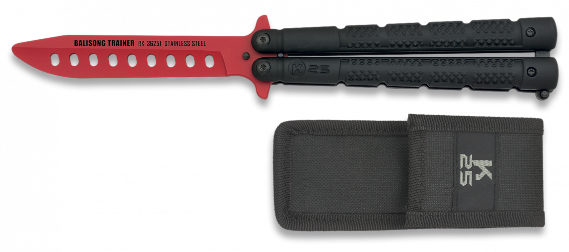 Głownia ze stali nierdzewnej z powłoką w kolorze czerwonym, długość całkowita 229 mm, długość klingi 102 mm, grubość klingi 4.0 mm, waga 142 g, rękojeść aluminium, blokada T-bar, w zestawie nylonowe etui.