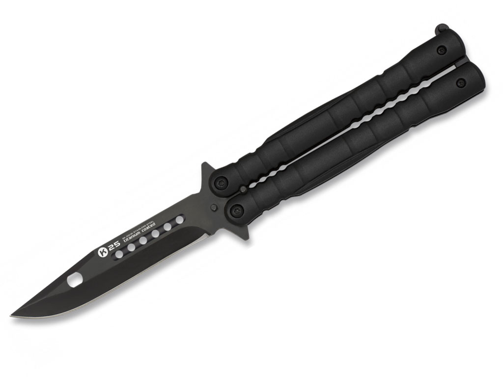 Głownia ze stali nierdzewnej z tytanową powłoką, długość całkowita 230 mm, długość klingi 103 mm, grubość klingi 2.7 mm, waga 140 g, rękojeść aluminium, blokada T-bar, w zestawie nylonowe etui.