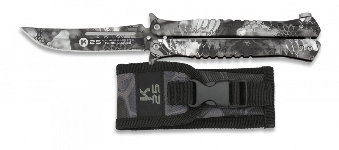 Głownia ze stali nierdzewnej z powłoką camo, długość całkowita 227 mm, długość klingi 100 mm, grubość klingi 3.4 mm, waga 153 g, rękojeść aluminium, blokada T-bar, w zestawie nylonowe etui.