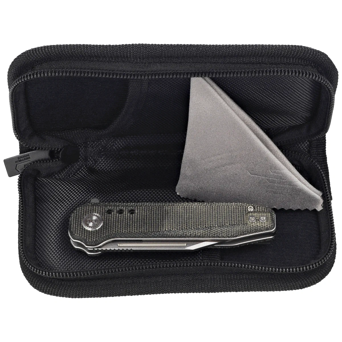 Rękojeść - okładziny z czarnej Micarty, tworzywa niewrażliwego na warunki atmosferyczne, odpornego na chemikalia i uszkodzenia mechaniczne Fazowane krawędzie okładek eliminują ostre ranty a teksturowanie powierzchni poprawia pewność uchwytu. Backspacer do którego przymocowano okładziny gwarantuje sztywność i wytrzymałość całej konstrukcji. Oś pivota ozdobiona logiem projektantów, Todd Knife and Tool. Dwupozycyjny (prawa/lewa) klips umożliwia przenoszenie noża w pozycji tip-up, czubkiem ostrza ku górze.