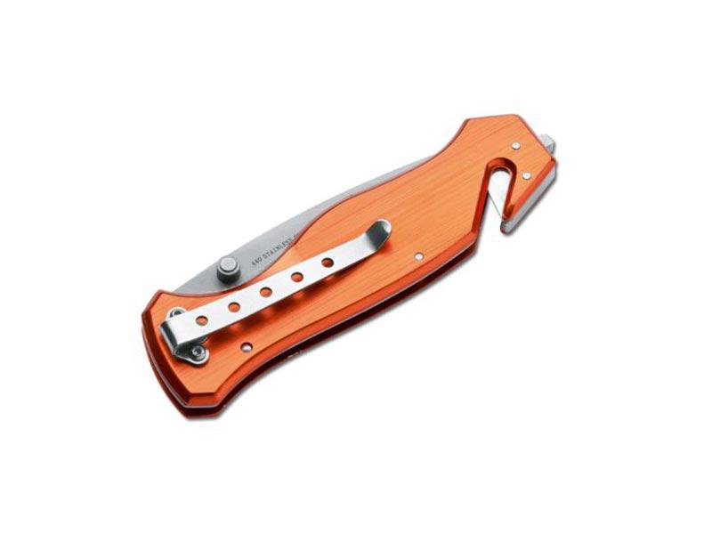 Nóż ratowniczy z klingą ze stali nierdzewnej 440. Okładki rękojeści z aluminium anodyzowanego na jaskrawo pomarańczowy kolor. Na końcu rękojeści zbijak do szyb. Klips do paska.