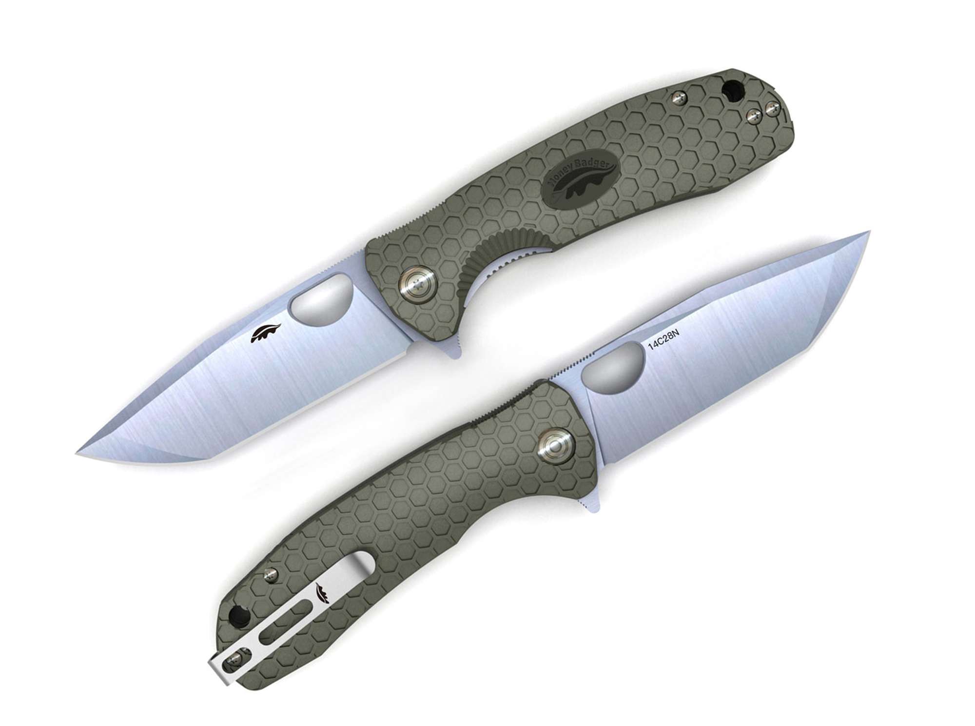 Honey Badger Tanto Medium zachwyca szczególnie solidną konstrukcją. Ostrze tanto 14C28N jest niezwykle wytrzymałe i łatwe w ostrzeniu. Gruby trzonek i szeroki profil z pełnym szlifem płaskim zapewniają stabilność i łatwość cięcia. Wysokiej jakości łożysko kulkowe umożliwia płynne otwieranie i zamykanie satynowanego ostrza, które można otworzyć za pomocą flipera lub rozwarcia kciuka. Wzór plastra miodu na teksturowanych, zielonych skalach rękojeści FRN zapewnia pewny chwyt. Z otworem na smycz i dwustronnym klipsem do głębokiego przenoszenia (przechylany do góry).