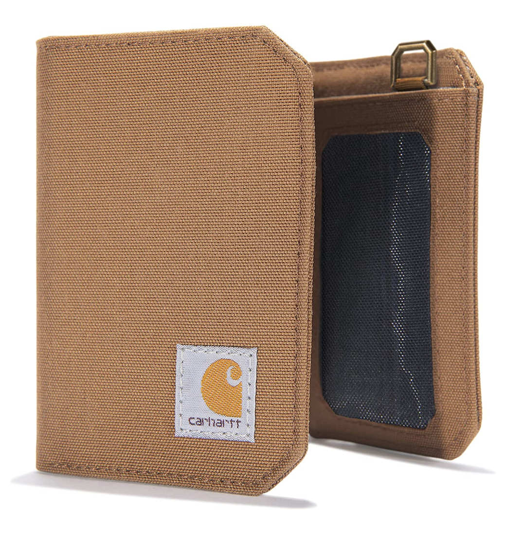 Męski, potrójnie składany portfel Carhartt Nylon Duck Trifold wykonany z wytrzymałego, wodoodpornego nylonu Cordura® z duża ilością przegródek wewnątrz. Najważniejsze funkcje i elementy produktu: Materiał: 100% nylon Cordura® (500 D) Wewnętrzna podszewka z płótna Trwałe, hydrofobowe wykończenie Rain Defender® Kieszonka na monety na zamek Przegroda na banknoty Okienko na dowód osobisty z siateczki Sześć przegródek na karty Zapakowany w kolekcjonerskie pudełko Wymiary: 11 cm x 9,3 cm x 1,8 cm Rain Defender®, (DWR) Trwała hydrofobowa powłoka dzięki której krople wody odbijają się od powierzchni materiału. Dzięki takiemu wykończeniu zewnętrzna warstwa materiału nie nasiąka wodą.